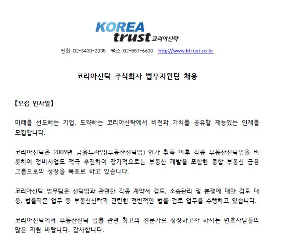 [취업-1401] 코리아신탁 주식회사 법무지원팀 채용공고(~1/23 금)