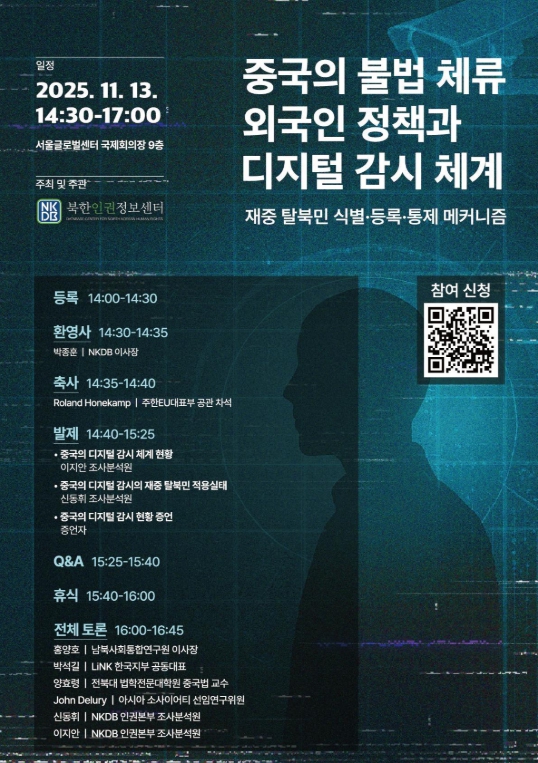 fnctId=bbs,fnctNo=3874 [북한인권정보센터] 중국의 불법 체류 외국인 정책과 디지털 감시, 재중 탈북민 식별·등록·통제 메커니즘 세미나(11월 13일) date 2025.10.27 name 법학전문대학원 e-mail view 21 첨부파일 첨부파일이(가) 없습니다.