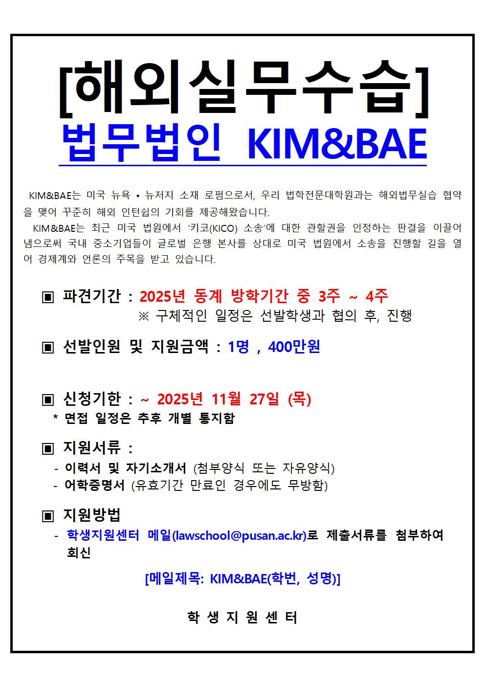 fnctId=bbs,fnctNo=3875 [2025년 동계 해외 실무수습-3] 법무법인 KIM&BAE (미국 뉴저지, ~11/27, 목) date 2025.11.19 name 법학전문대학원 e-mail view 155 첨부파일 이력서 및 자기소개서_법무법인 KIM&BAE(자유양식 가능).hwp 미리보기