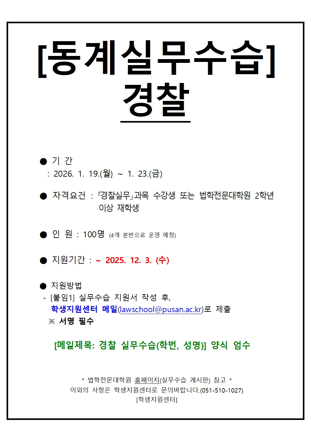 fnctId=bbs,fnctNo=3875 [2025년 동계 국내 실무수습-22] 경찰(~12/3 수) date 2025.11.25 name 법학전문대학원 e-mail view 161 첨부파일 2026년 동계 경찰실무수습 모집 안내_홈페이지 게시용.hwp 미리보기 [붙임1] 2026년 동계 경찰실무수습 지원서 (학생용).hwp 미리보기