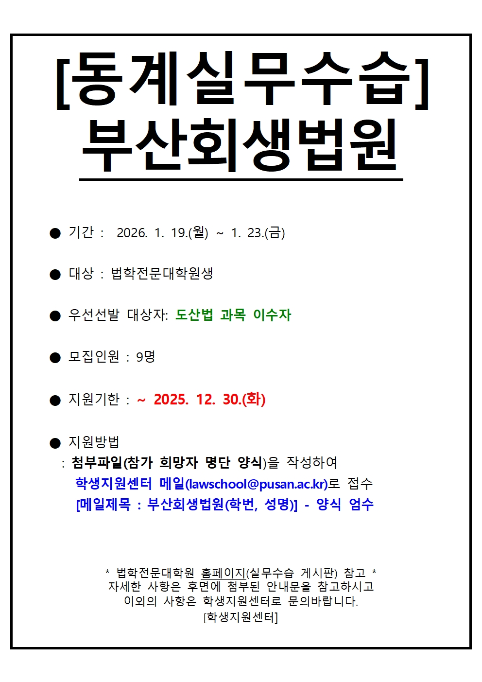 fnctId=bbs,fnctNo=3875 [2025년 동계 국내 실무수습-28] 부산회생법원(~12/30 화)(수정: 2025-12-22) date 2025.12.22 name 법학전문대학원 e-mail view 162 첨부파일 2026년 법학전문대학원 실무수습 프로그램 실시 계획_홈페이지 게시용.pdf 미리보기 참가 희망자 명단 양식.xlsx 미리보기