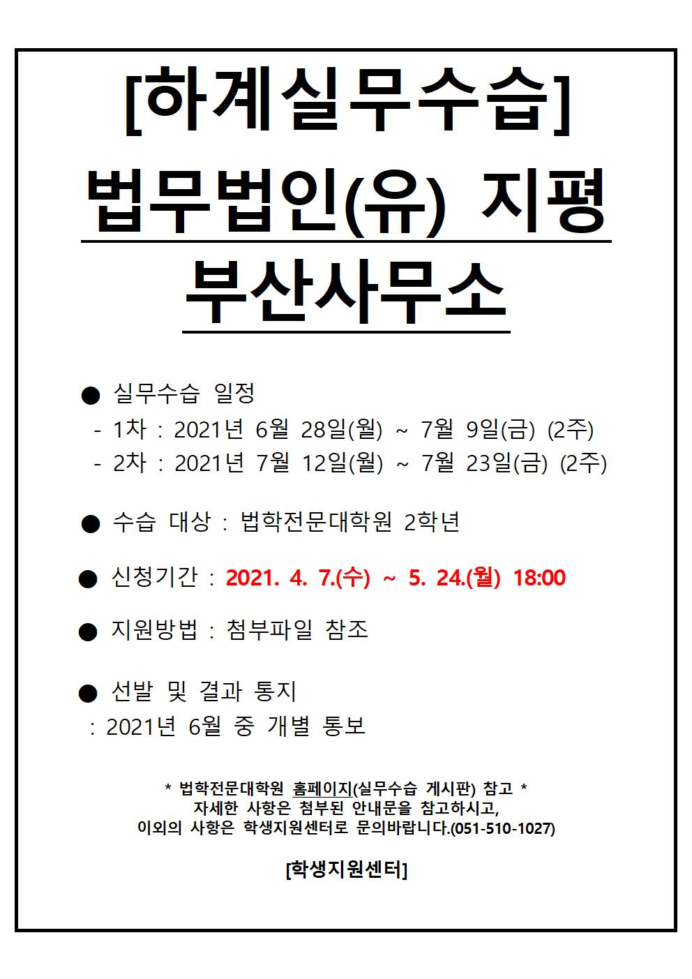 fnctId=bbs,fnctNo=3875 [2021년 하계 국내 실무수습-6] 법무법인(유) 지평 부산사무소(~5/24 수, 2학년 대상) date 2021.04.07 name 윤지훈 e-mail view 604 첨부파일 210407_2021학년도 하계 법무법인(유) 지평 부산사무소 실무수습 안내문.pdf 미리보기 인턴(법학전문대학원)_이력서 양식.docx 미리보기