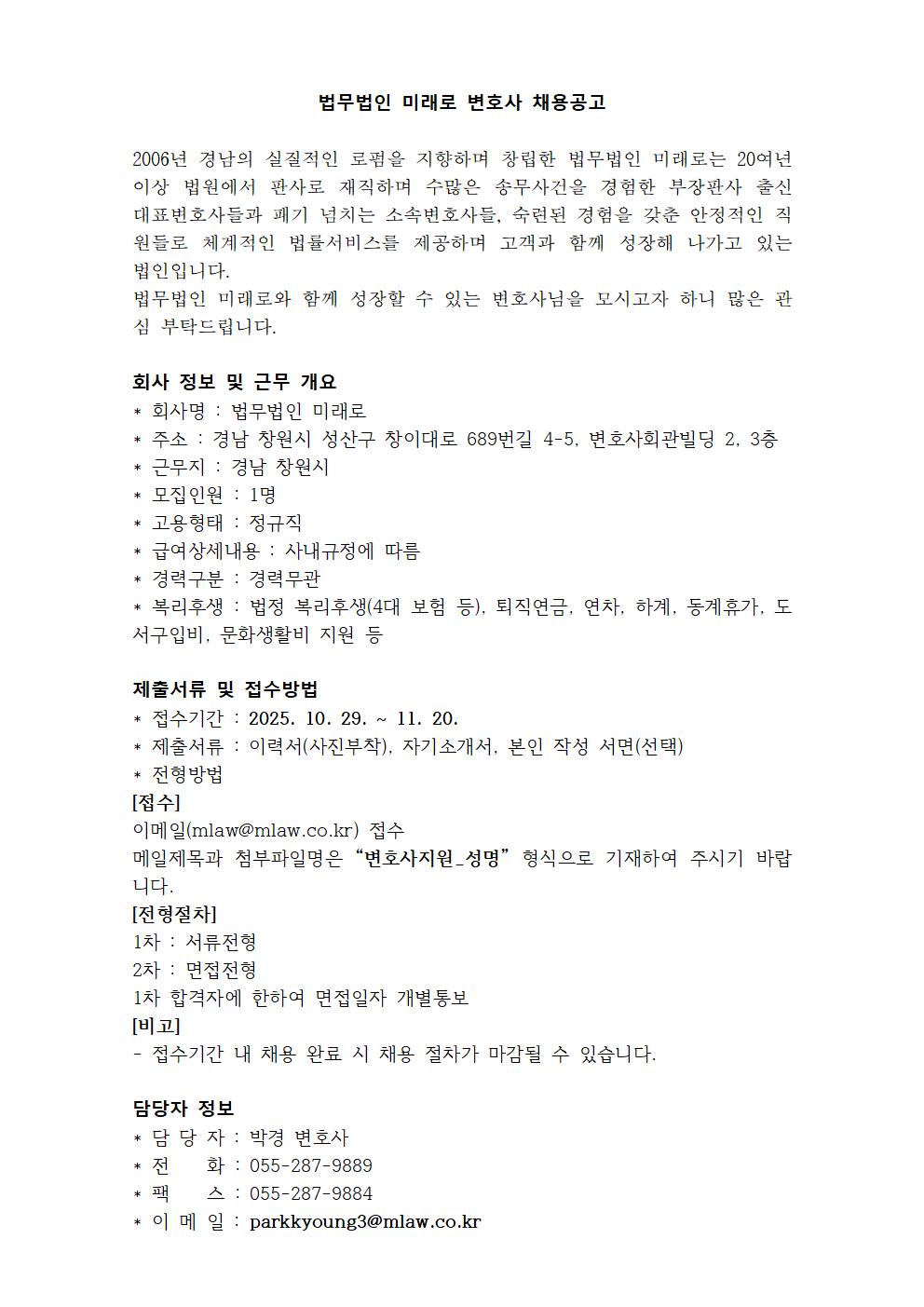 fnctId=bbs,fnctNo=3876 [취업-1387] 법무법인 미래로 변호사 채용공고(~11/20, 목) date 2025.10.24 name 법학전문대학원 e-mail view 43 첨부파일 첨부파일이(가) 없습니다.