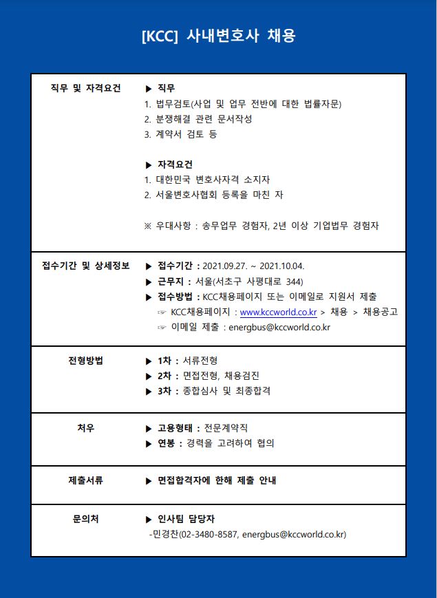 fnctId=bbs,fnctNo=3876 [취업-929] KCC 사내변호사 채용공고 (서울, ~10/4 월) date 2021.09.28 name 박지현 e-mail view 294 첨부파일 첨부파일이(가) 없습니다.