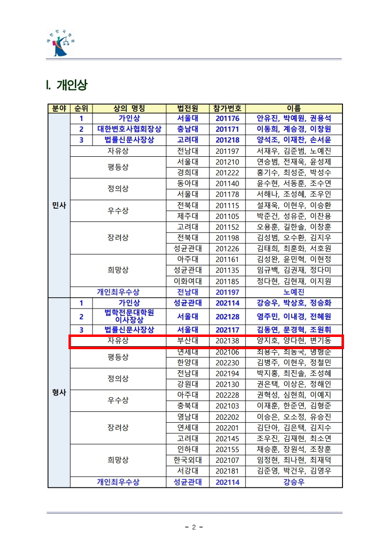 이번 대회에서 부산대학교 법학전문대학원 양지호, 양다현, 변기동 (11기, 19학번) 씨가 가인법정변론대회 형사부문에서 자유상의 영예를 안았습니다.