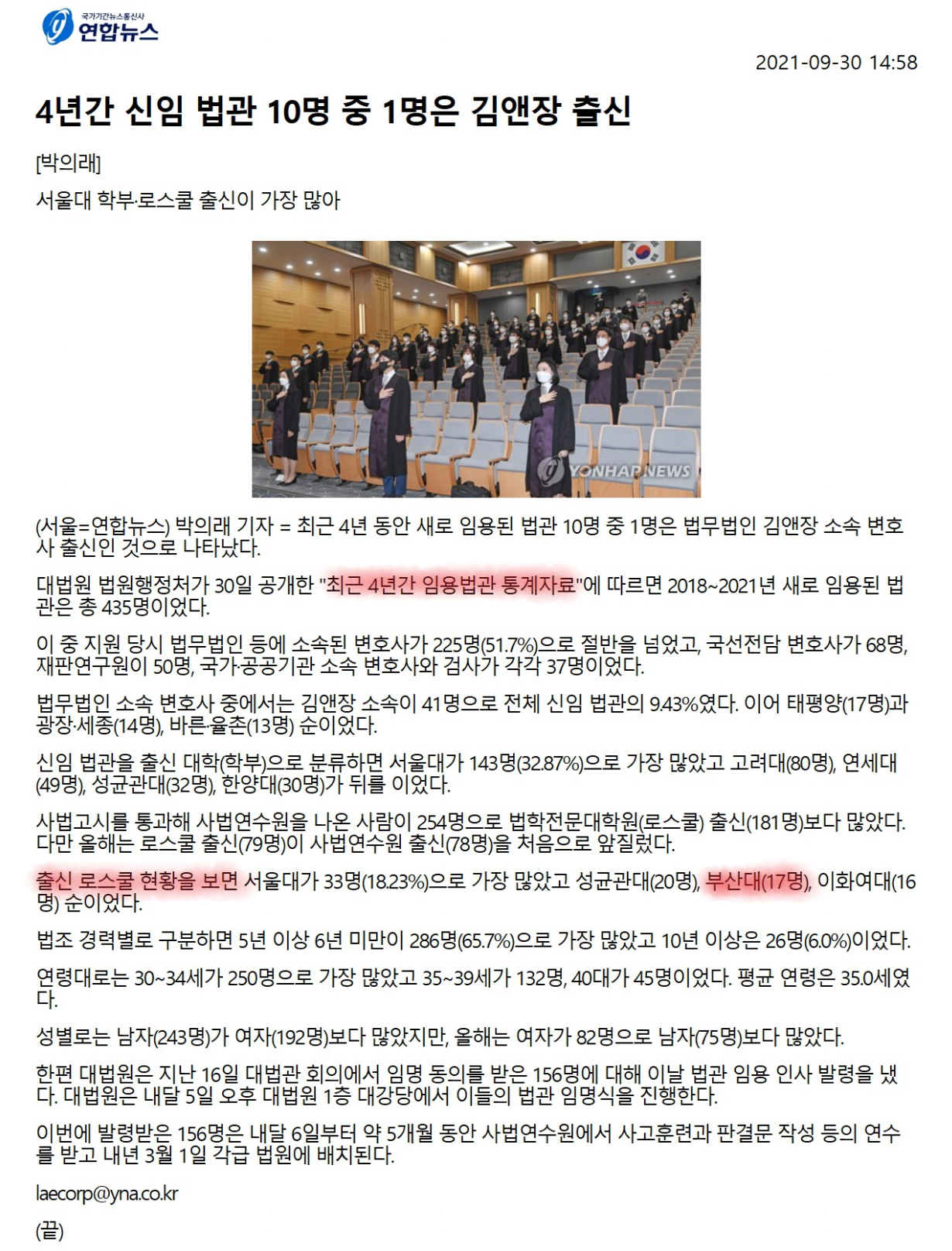 fnctId=bbs,fnctNo=3877 [보도] 최근 4년간 임용범관 통계자료상 '부산대 전국 로스쿨 중 3위' date 2021.10.01 name 박지현 e-mail view 1705 *관련기사: 4년간 신임 법관 10명 중 1명은 김앤장 출신 | 연합뉴스 (yna.co.kr) 첨부파일 첨부파일이(가) 없습니다.